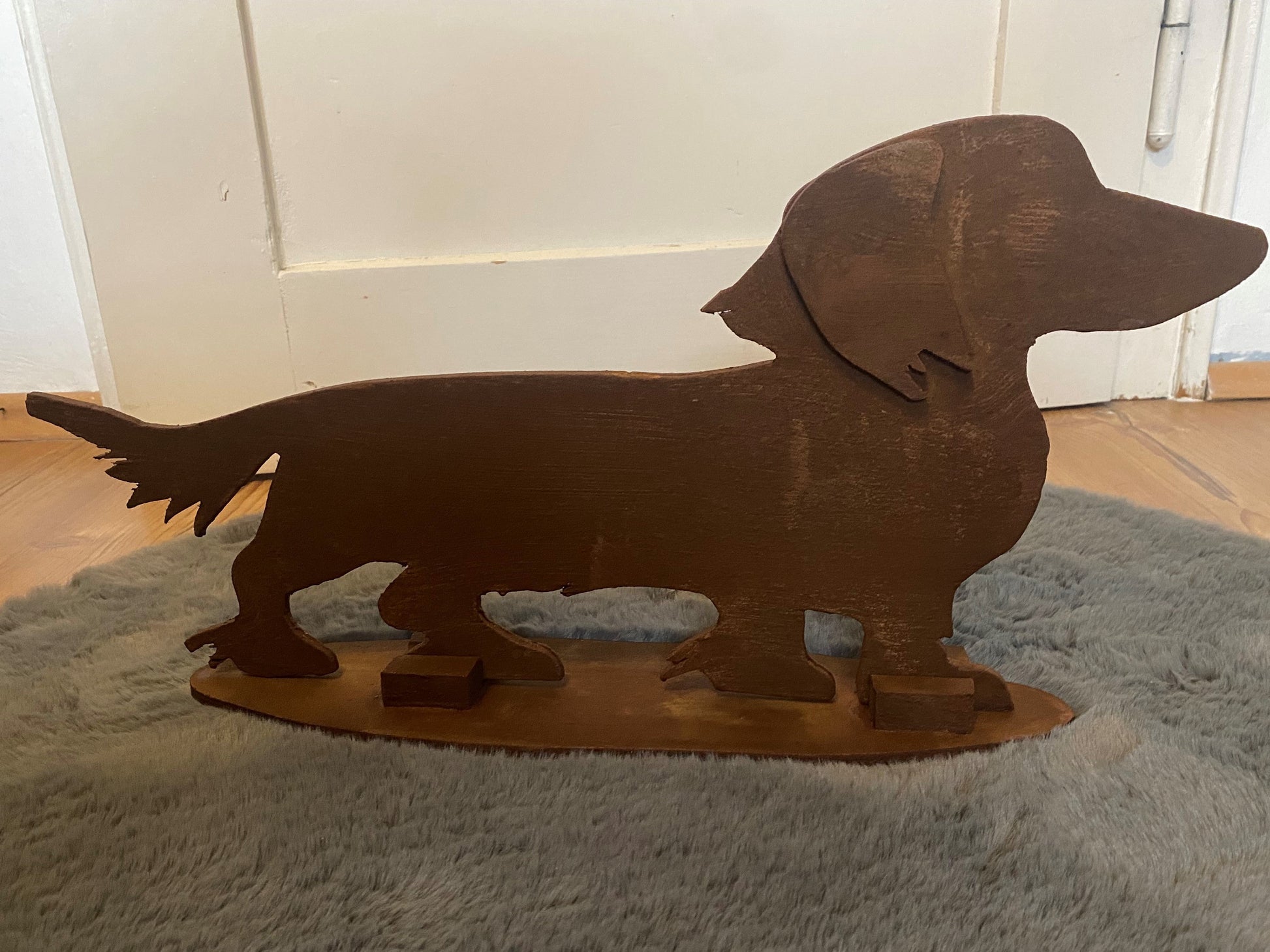 Mit diesem dekorativen Dackel erwerben Sie ein echtes Unikat. Nicht nur, dass er handwerklich gefertigt wurde- obwohl er aus Kiefernholz ist, ist die äußerste Schicht echter Rost. Er eignet sich sowohl als Deko für den Innen- wie den Außenbereich. Der ebenfalls in Handarbeit gefertigte Aufsteller ist mit dabei.