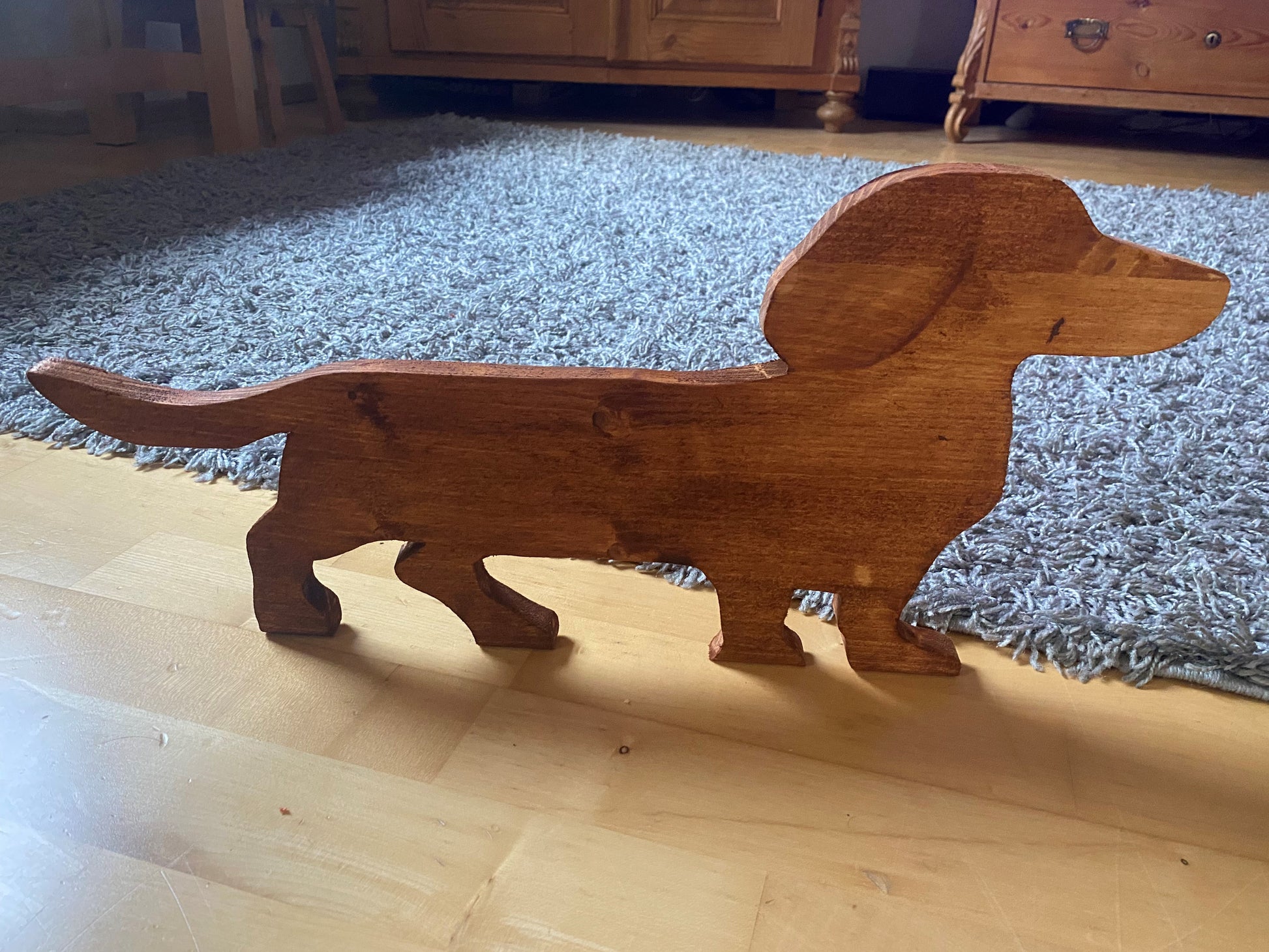 Mit diesem dekorativen Dackel erwerben Sie ein echtes Unikat, handgefertigt. Dank der Holzlasur eignet er sich als Deko für den Innen- sowie den Außenbereich. Durch die Breite von 2,5 cm steht er praktisch von selbst.